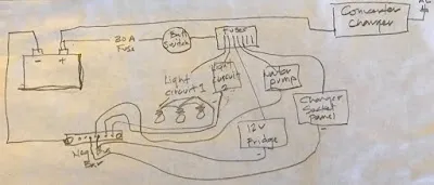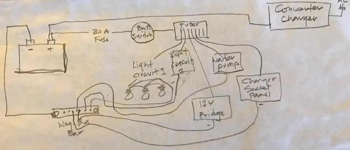 I spent some time looking around at the main parts of the wiring system trying to understand what was going on. I thought about relocating the house battery to a different place. I did some more reading in the 12 volt book. Then I took a whack at a wiring diagram: