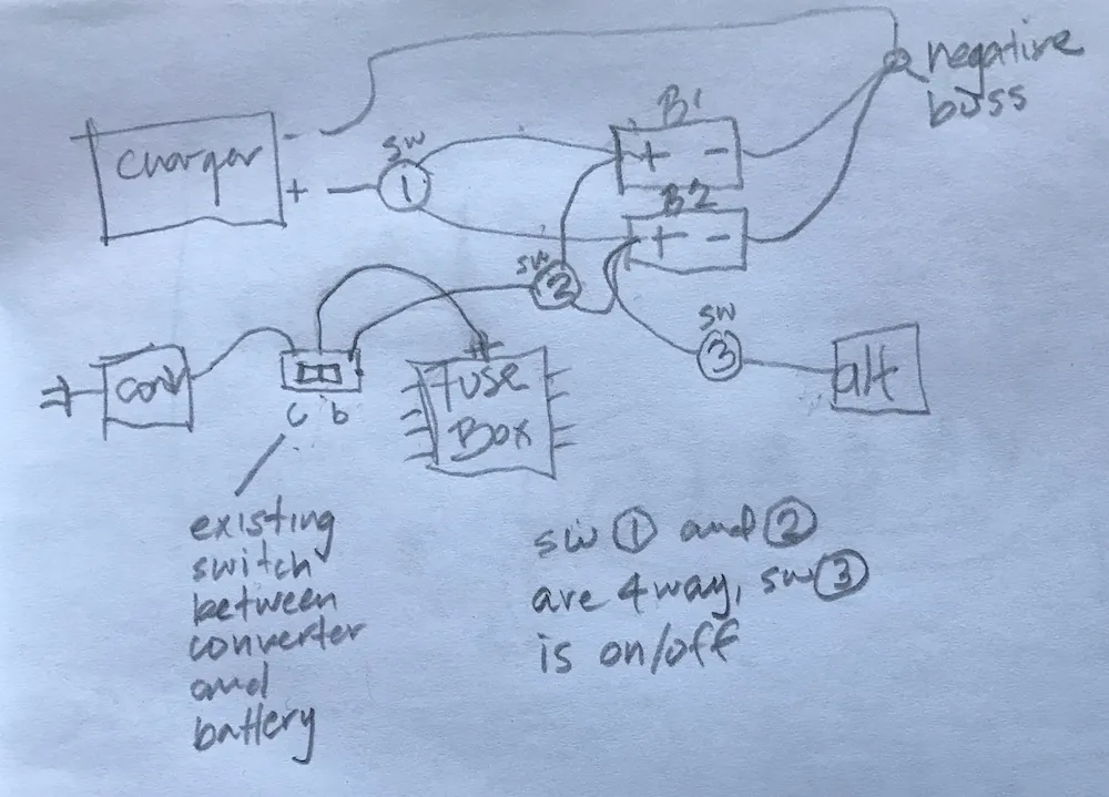 I have three batteries I want to accommodate in the Beaver (it came with one). One of them is the chassis or starting battery. The other two are house batteries meaning they are used for 12 volt lights and appliances in the coach. Normally the two house batteries would be wired together in parallel but that requires they be of the same type, age and model. Mine are are not the same so I am going to wire them so that I can use them separately with a switch. When one is low I can just switch over to the other. The same thing works in charging – one at a time. On top of that there is an existing wire running from the alternator to the battery bay allowing the house battery to be charged by the alternator when the motor is running. The problem is that with new battery types, this is no longer a good thing without some more hardware to manage the charging process. I don’t want to add that hardware, but I am going to keep that wire in place and put a manual switch on it, which complicates things a bit. So I have three batteries and three manual switches to wire up. I think it should look like this: