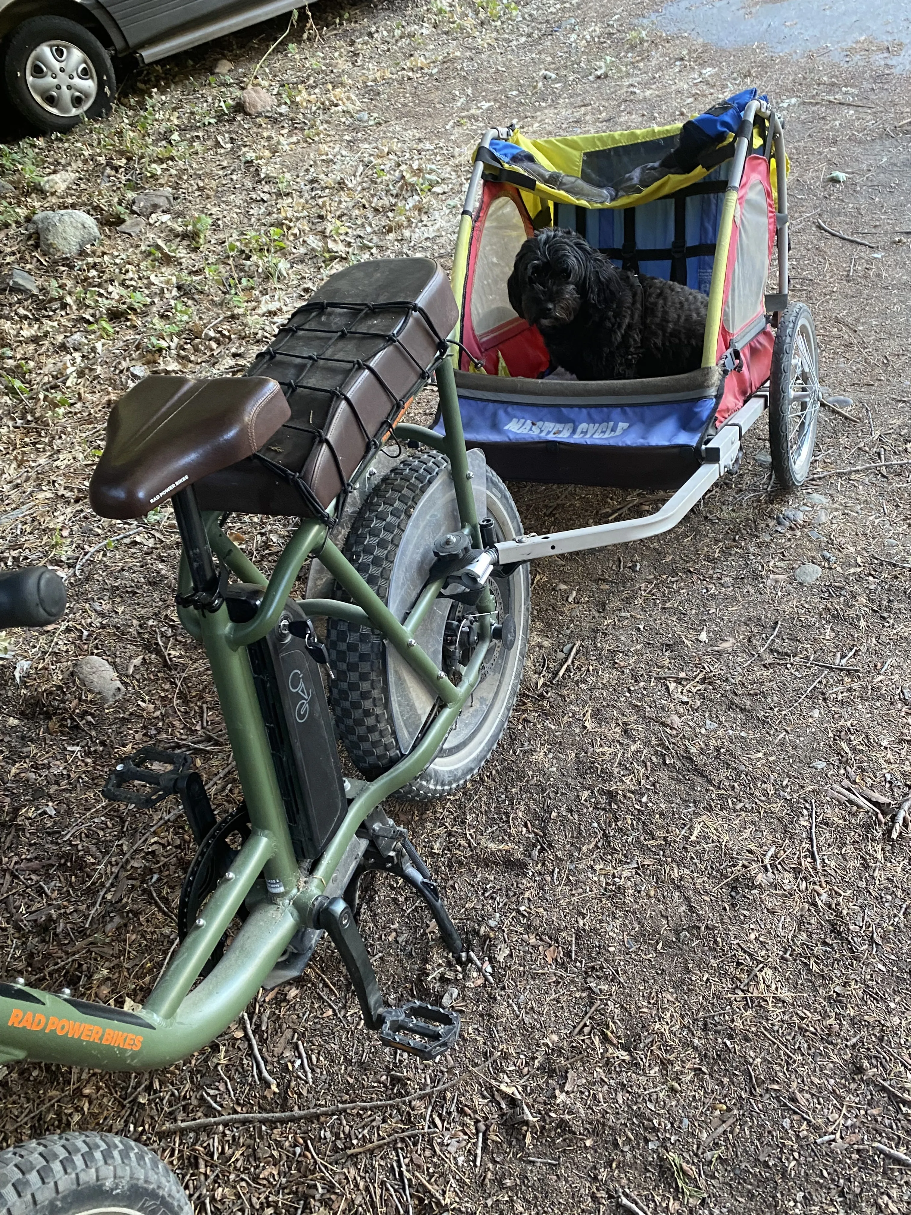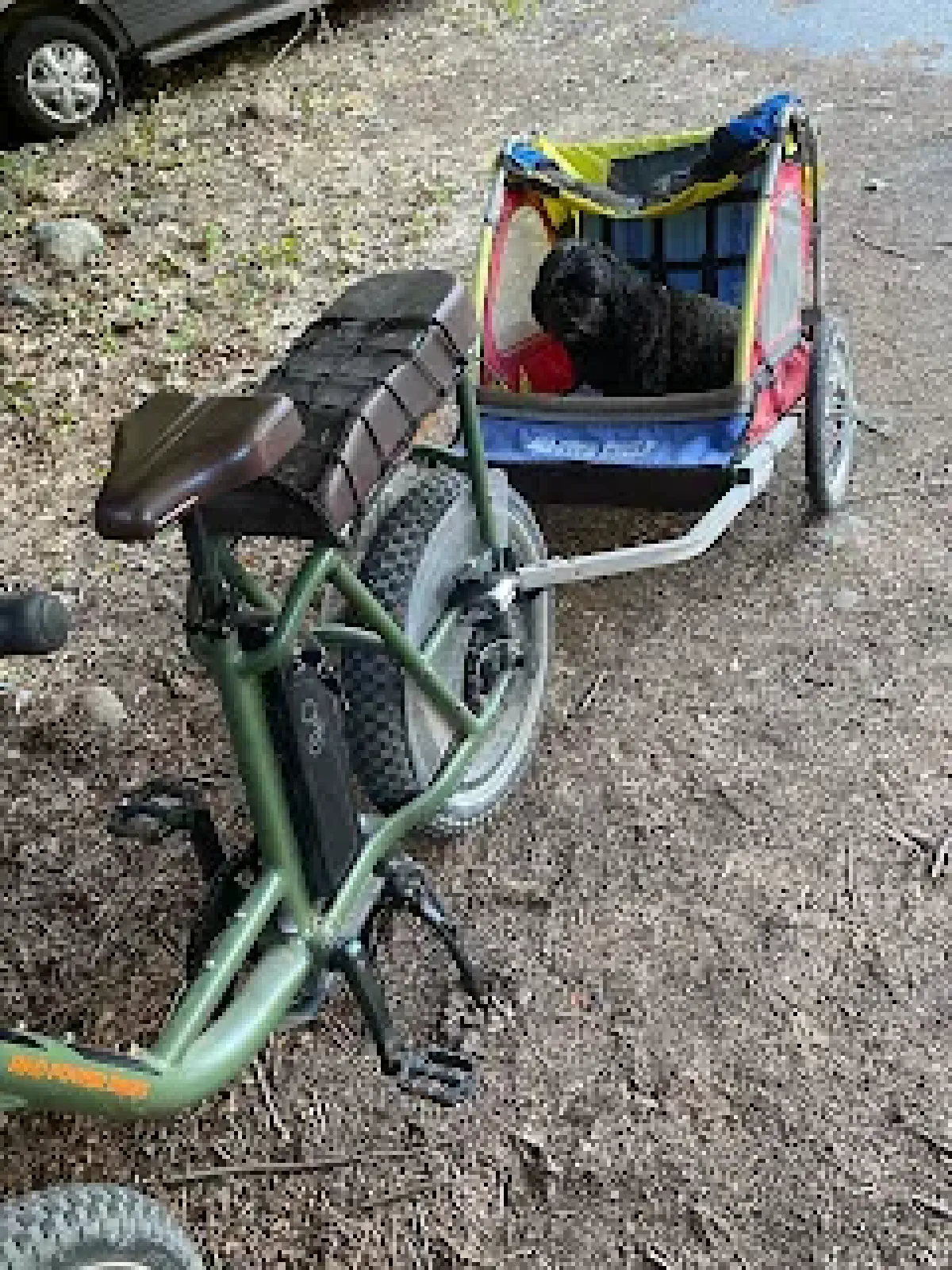 Dragging BB around in a trailer behind an e-bike. I borrowed this bike and trailer, ‘cause I want to build or buy my own. Thinking about possible different configurations. This could be a new, fun hobby for us!