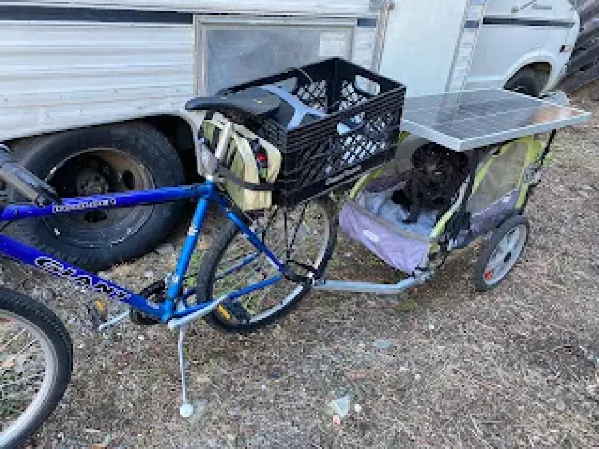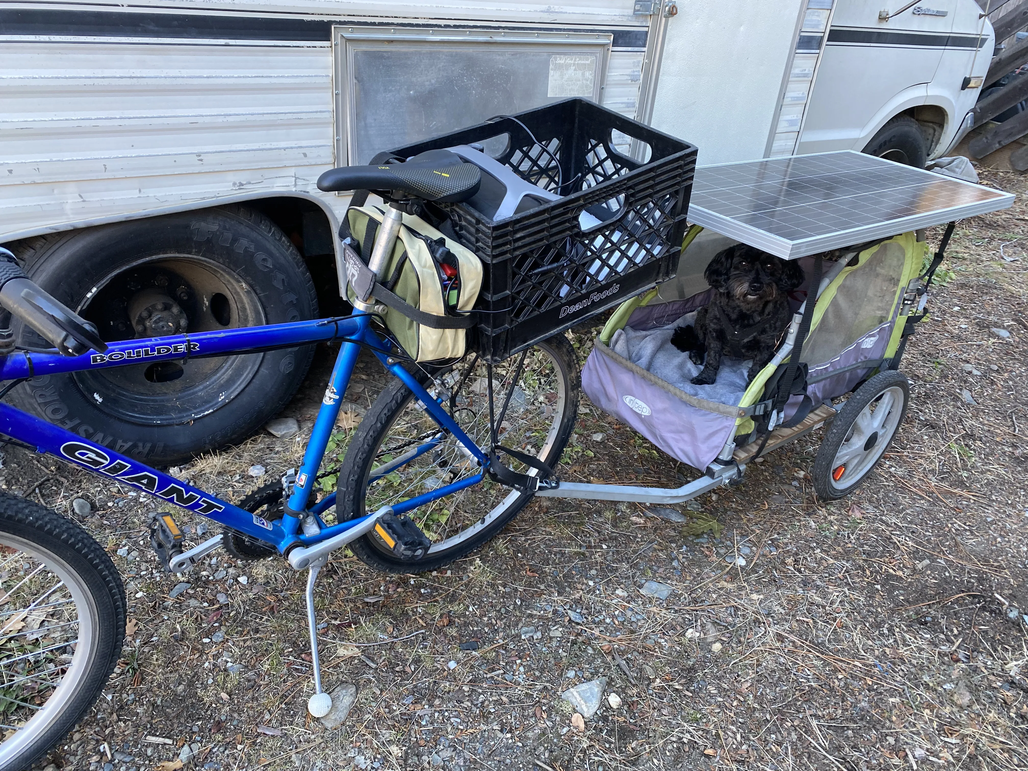 I moved all the e-bike components to the new bike I bought for $20 at a local thrift store because the frame was better I think. I also added a solar panel. The idea is to charge the e-bike while I ride it. That panel isn’t going to make it so that I can ride indefinitely but it does extend the range.