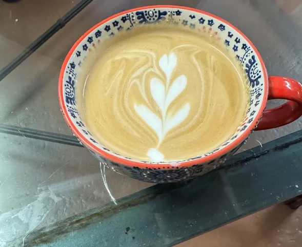 Not out of habit, but because this one is just… so. It lands perfectly in that narrow gap between bitter and comfort, with milk frothed into silk and a leaf—or a heart, or a flame—floating in the center like some caffeinated mandala.