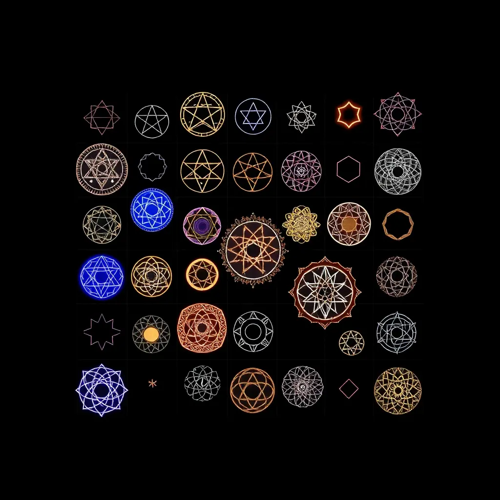 In the middle: sacred geometry. Mandalas with n-fold symmetry. Flowers of Life — seven overlapping circles of equal radius, the geometry of packing. Rose curves with 3, 5, and 7 petals. Star polygons: pentagram, heptagram, octagram. Forms that feel like they belong in a temple and also in a textbook.